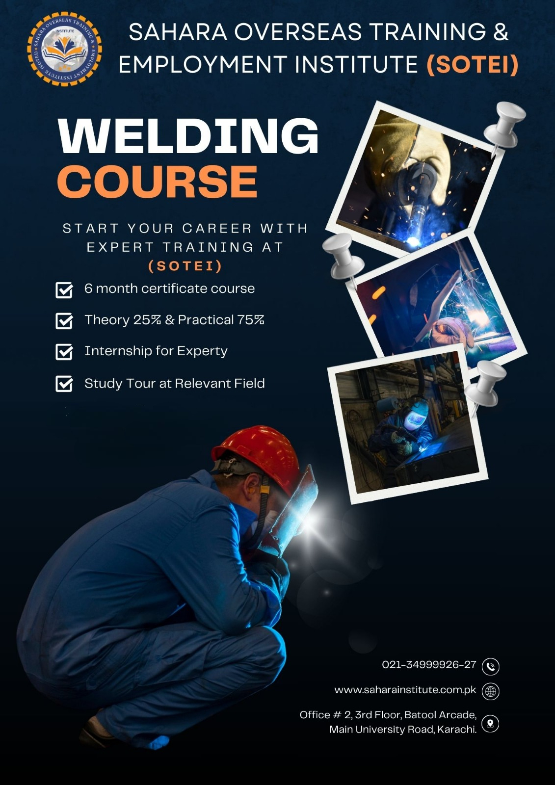 A unique aspect of the Welding Course at SOTEI Institute is its focus on modern welding applications and high-demand sectors, such as construction, automotive, aerospace, and manufacturing. Students are introduced to advanced techniques, including pipe welding and structural welding, which are essential for more complex and large-scale projects. This training broadens their career options, preparing them for specialized roles in the industry and making them highly sought after by employers.